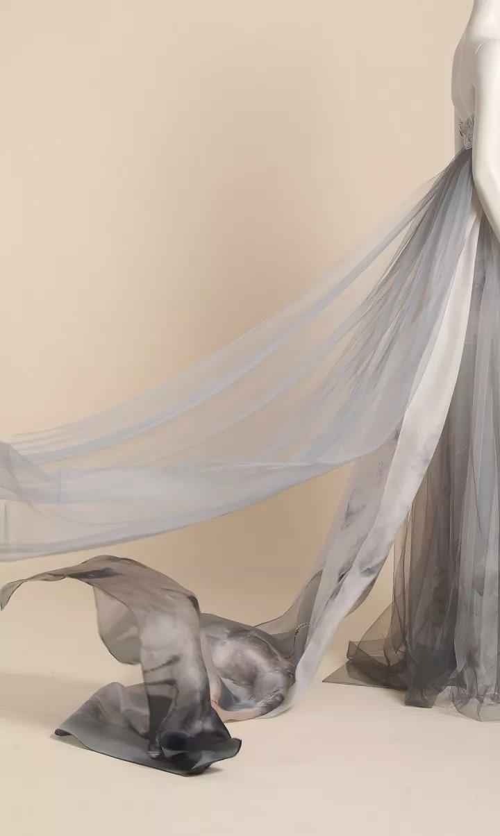 模特身着轻纱叠透,头带斗箩杨柳,由远处缓缓走来,墨荷摇曳,幻雅生姿,逸风清扬,翩然于飞。完美的展现东方美的想像空间和灵动性。